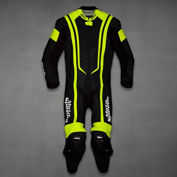 - TPU shoulder and knee molds for protective rigidity within a premium leather race suit.