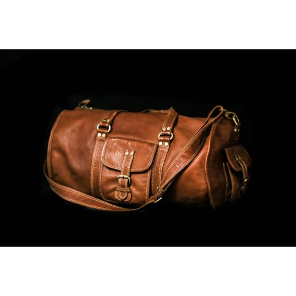- Construction: External shell: leather; two carry handles; removable shoulder strap; exterior pockets: two side buckle strap pockets with flap; front buckle strap pocket with flap; back zip pocket; internal lining: heavy cotton; small internal zip pocket for cards/wallet