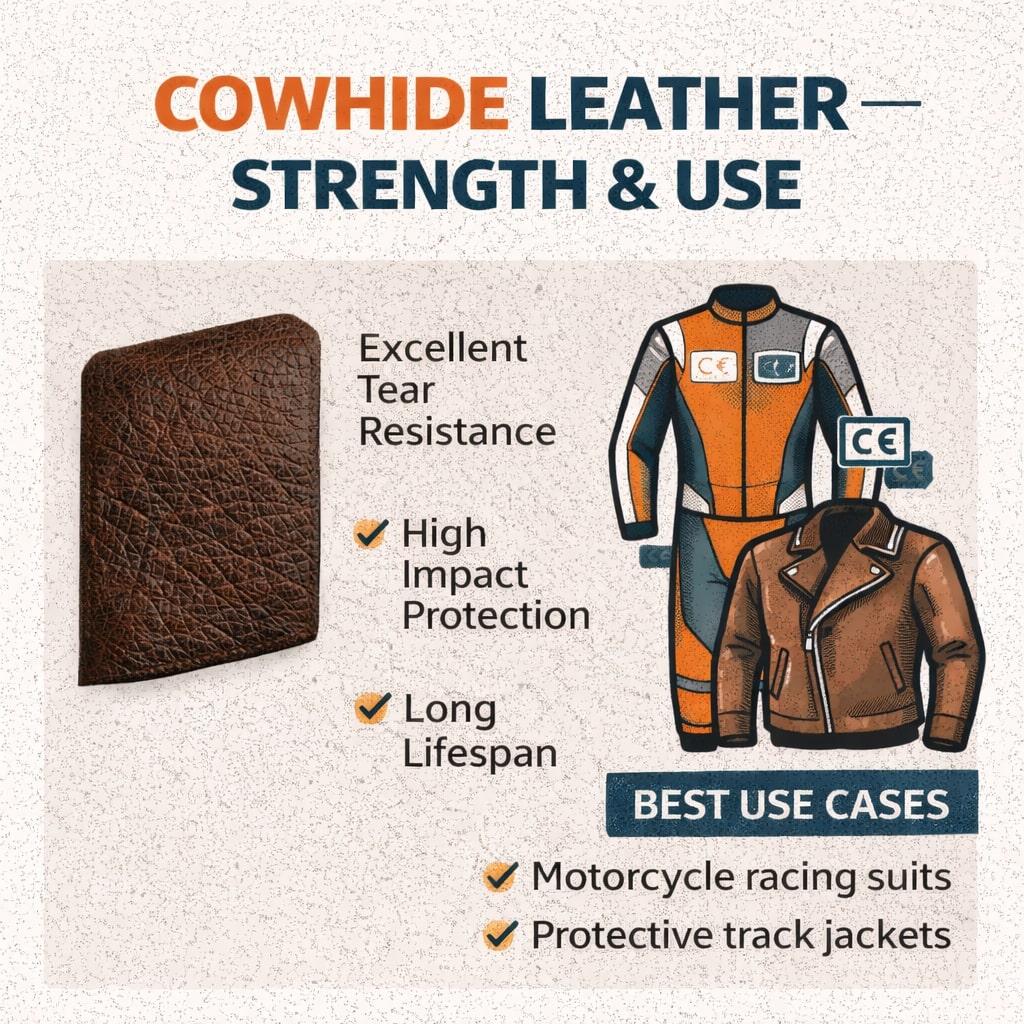 Cowhide is the most common and widely used leather in motorcycle gear. It’s thick, tough, and reliable.