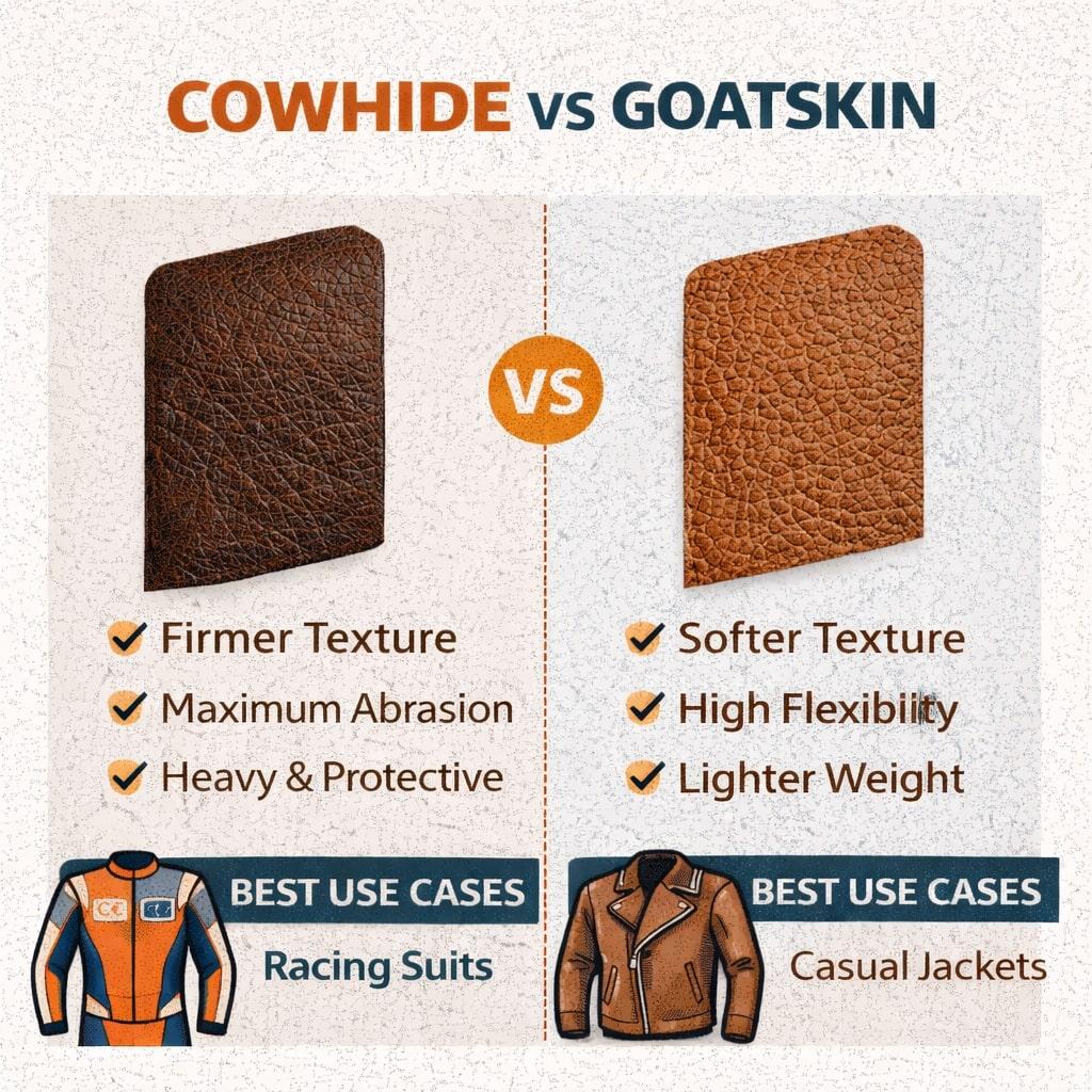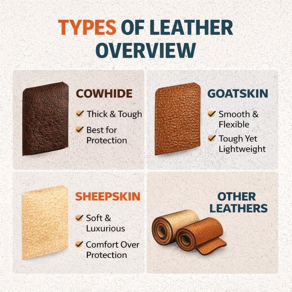 If protection matters, choose cowhide. If comfort matters, goatskin works well. For style, sheepskin shines.