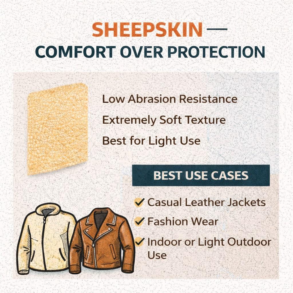 Sheepskin is known for softness and comfort. It’s lightweight and luxurious but less rugged.