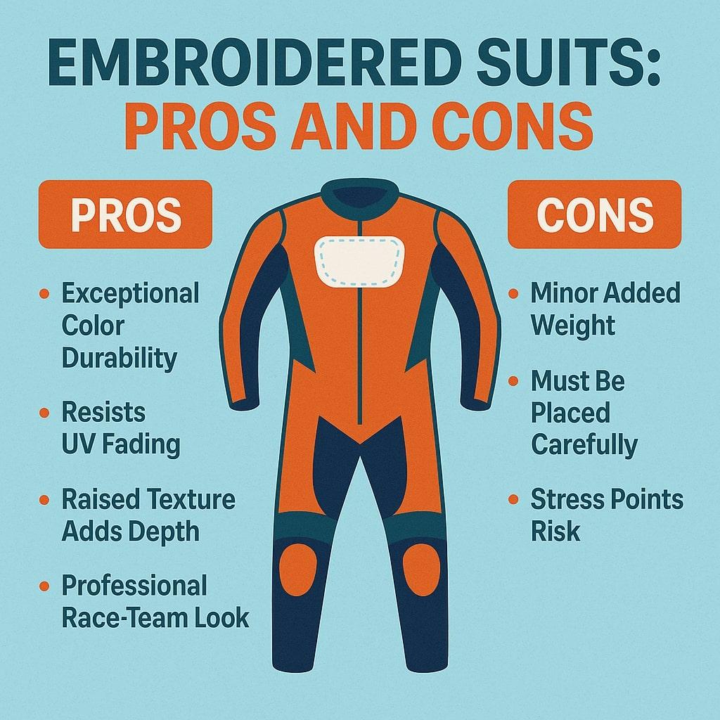 On average, embroidered logos last 30–40% longer than printed graphics on race suits.