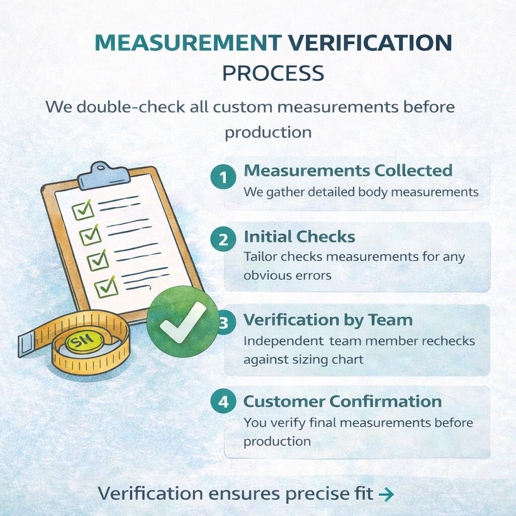 If you chose standard sizing, we still review your height and weight. If you selected made-to-measure, we request detailed body measurements.