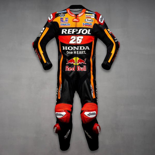 - Style / Design Features: Black leather race suit with Honda Repsol branding; aerodynamic hump option