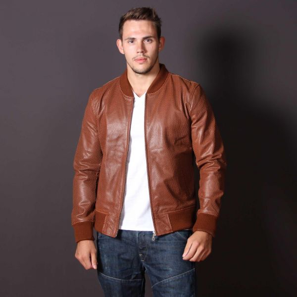 - Full perforated design provides ventilation in a perforated goatskin bomber jacket, ideal for motorcycle riding gear.
