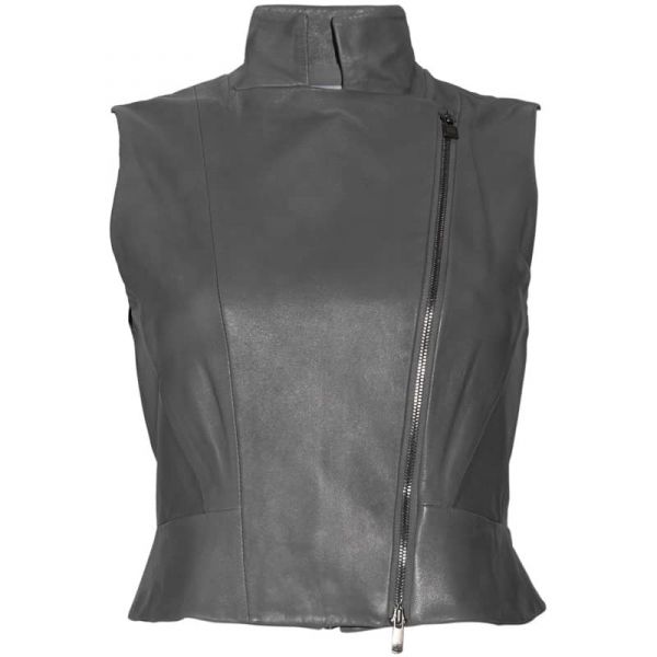 - Stand up collar design adds modern edge to this sleeveless leather vest.
