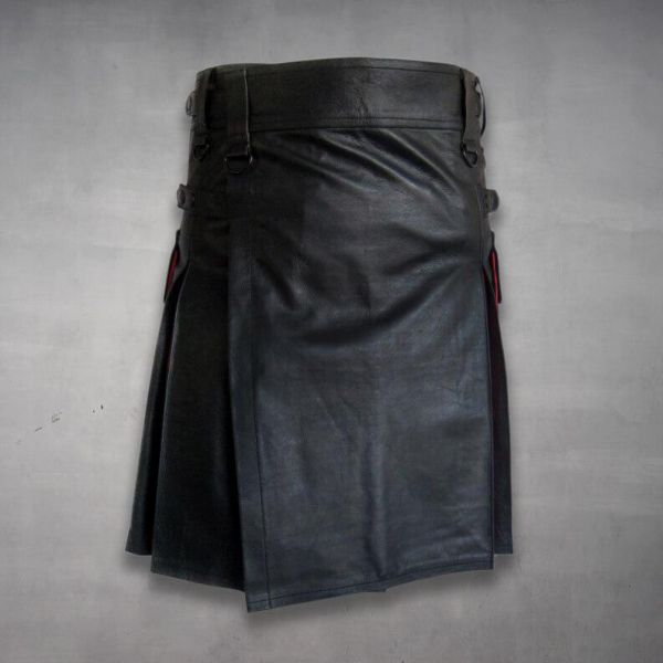 - Bold black and red edge detailing on the back and pockets for a hybrid leather kilt look