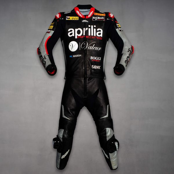 - Aprilia suit crafted from top-grain leather, drum-dyed for exceptional abrasion resistance and durability—ideal for professional motorcycle racing and track riding.