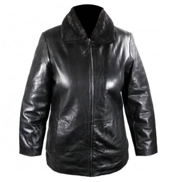 - Style / Design Features: Classic leather riding jacket design; removable fur collar; front zip