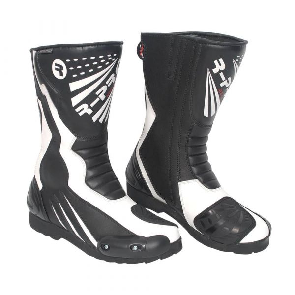 Outer Shell- Premium black-and-white leather motorcycle boots with a full-grain leather upper for long-lasting protection and durability.
