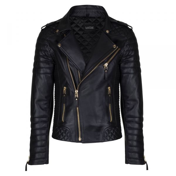 Quilted Mens Black Leather Biker Jacket with Golden Hardware