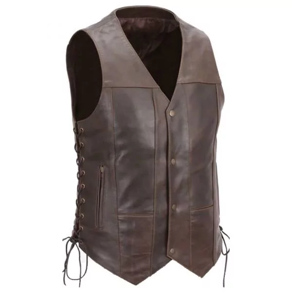 - Style / Design Features: Tan cowhide vest with four-pocket front; side laces for club look; classic snap-front; biker-ready hardware