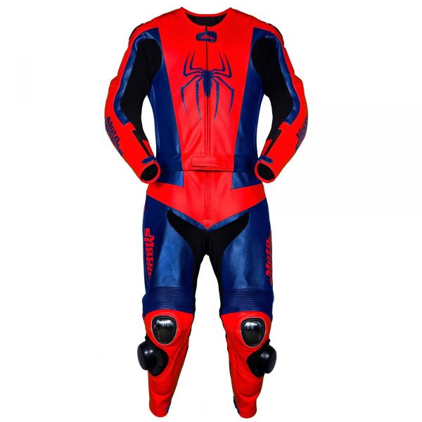 - Spiderman leather race suit uses race-geometry design with high-performance safety materials for competitive racing.
